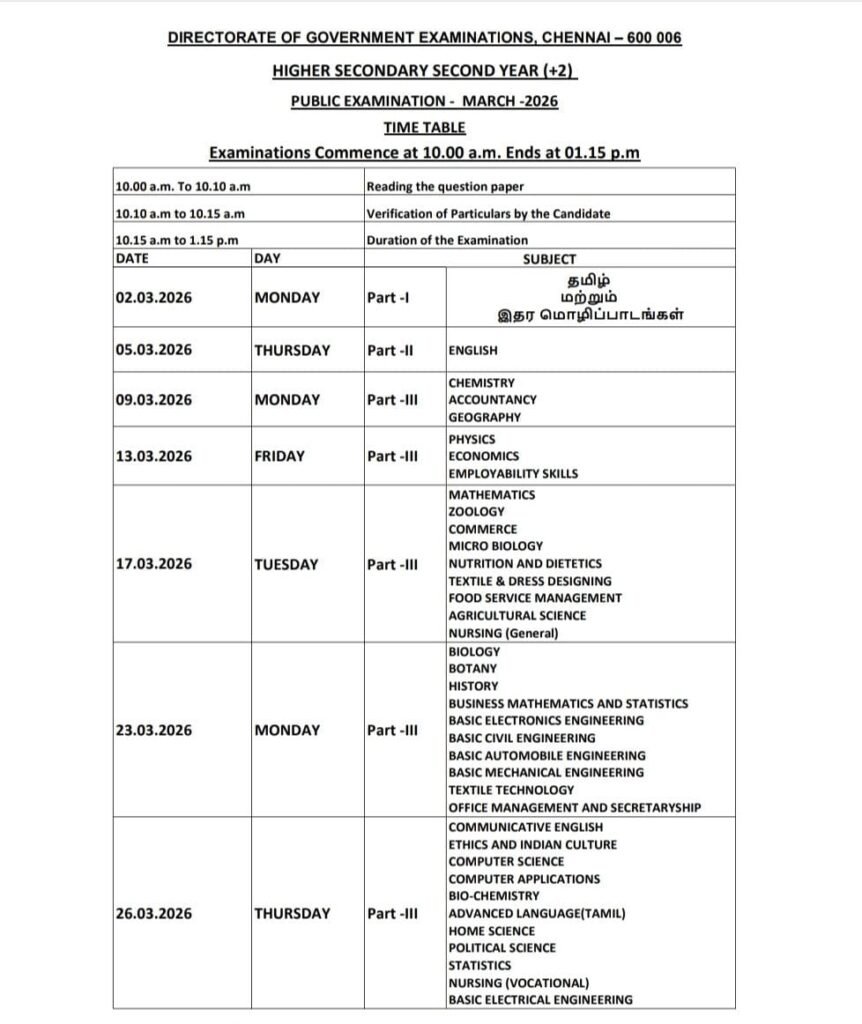 தமிழகத்தில் பள்ளிப் பாடத்திட்டத்தின் கீழ் 10 ஆம் வகுப்பு மற்றும் 12 ஆம் வகுப்பு மாணவர்களுக்கான பொதுத் தேர்வு அட்டவணை இன்று வெளியிடப்பட்டுள்ளது.