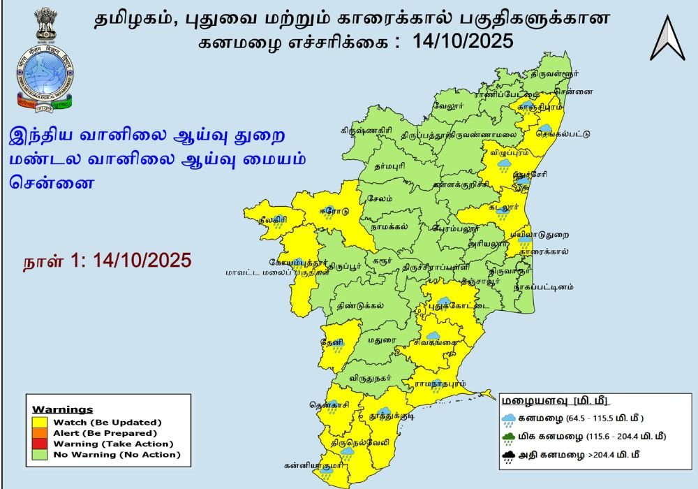 14-10-2025: தென்தமிழகத்தில் அநேக இடங்களிலும், வடதமிழகத்தில் ஒருசில இடங்களிலும், புதுவை மற்றும் காரைக்கால் பகுதிகளிலும், இடி, மின்னலுடன் கூடிய லேசானது முதல் மிதமான மழை பெய்யக்கூடும்.