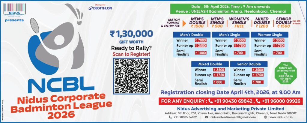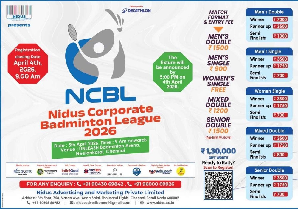 நிறுவனங்களில் பணியாற்றும் இளைஞர்கள் மற்றும் விளையாட்டு ஆர்வலர்களை ஊக்குவிக்கும் வகையில், நிடஸ் அட்வர்டைசிங் அண்ட் மார்க்கெட்டிங் நிறுவனம் (NIDUS Advertising and Marketing Private Limited) சார்பில் ‘என்சிபிஎல் – நிடஸ் கார்ப்பரேட் பேட்மின்டன் லீக் 2026’ (NCBL – Nidus Corporate Badminton League 2026) போட்டி சென்னையில் பிரமாண்டமாக நடைபெற உள்ளது.