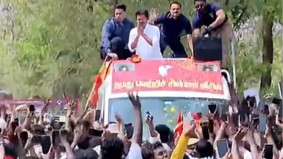 தவெக தலைவர் விஜய் இன்று காரைக்குடியில் தேர்தல் பிரசாரம் மேற்கொள்ள திட்டமிட்டு இருந்தார். இதற்காக சென்னையில் இருந்து தனி விமானம் மூலம் மதுரை வந்த விஜய், அங்கிருந்து தனது பிரசார வேனில் பயணித்தபடி காரைக்குடி சென்றார்.